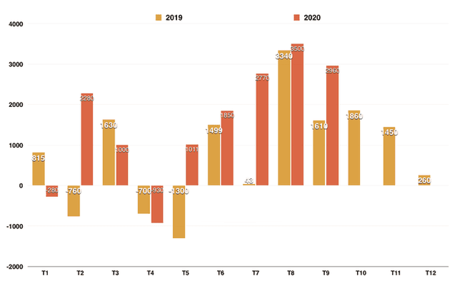 Trade balance of Vietnam by month for the period 2019-2020 (unit: million USD)
